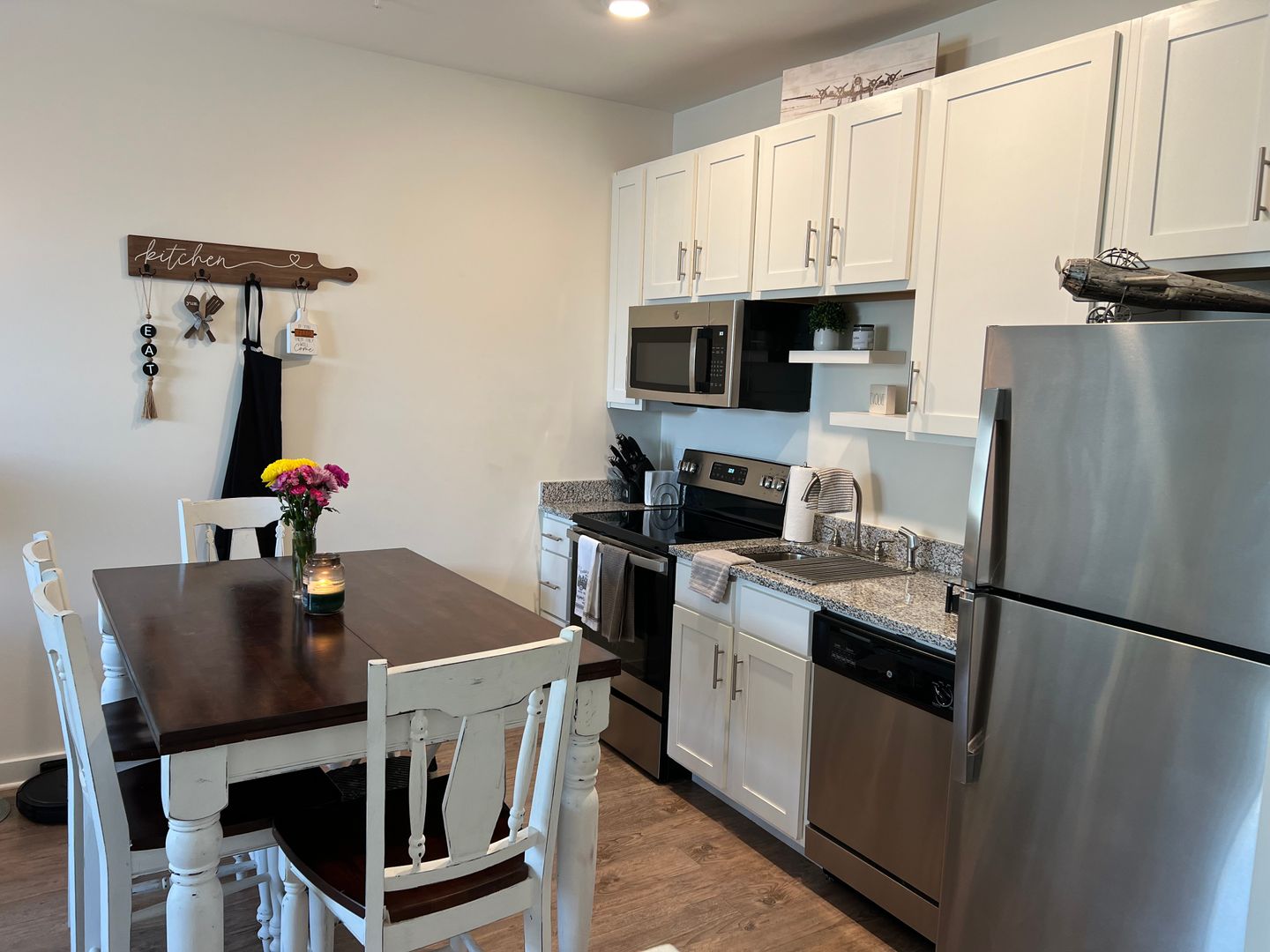 Residents will bask in spacious 1, 2 and 3 bedroom cottage style apartment plans or elegant one and 2 bedroom apartment plans in the Manor building, each presenting designer inspired interiors with graceful wood plank flooring, oversized windows for an abundance of natural light and gourmet kitchens with granite countertops, stainless steel appliances and convenient kitchen islands with striking dark gray shaker cabinetry. Bedroom suites feature extra-large or walk-in closets and spa inspired bathrooms include unique touches like Roman soaking tubs or walk-in showers.